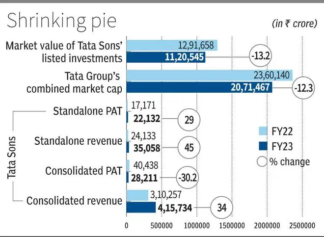 Tata Sons, the holding company of the Tata Group, has seen an annual 13 per cent dip in the market value of its investments to ₹11.2-lakh crore in FY23, its annual report showed.