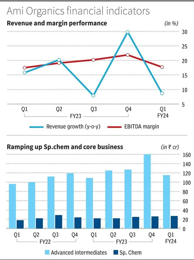 But this growth is substantially below growth rates expected for Ami Organics by investors, which are in the high 18-20 per cent range. A decline in chemical raw material costs (impacts pricing at the top line) and sluggish demand in Pharma were reported reasons for lower growth in Q1FY24. The first quarter is also the slow season for the company.